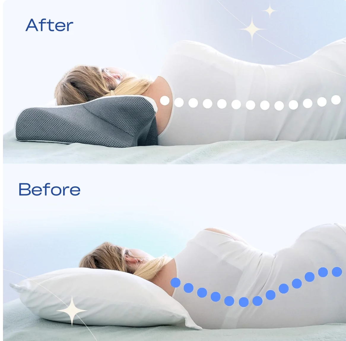 Answer 1: This pillow features an ergonomic contour that cradles your neck and head, promoting optimal spinal alignment during sleep. By supporting the natural curve of your cervical spine, it helps reduce strain on your neck and shoulders, alleviating common issues like neck pain and tension. This design encourages healthier sleeping positions, enhancing your overall sleep posture for more restorative rest.